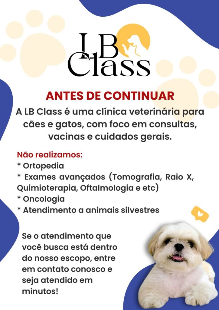 Fundada com o propósito de unir ciência, amor e dedicação, a LB Class é uma clínica veterinária moderna, equipada para oferecer um cuidado completo aos pets, sempre com atenção aos detalhes e respeito às individualidades de cada animal.